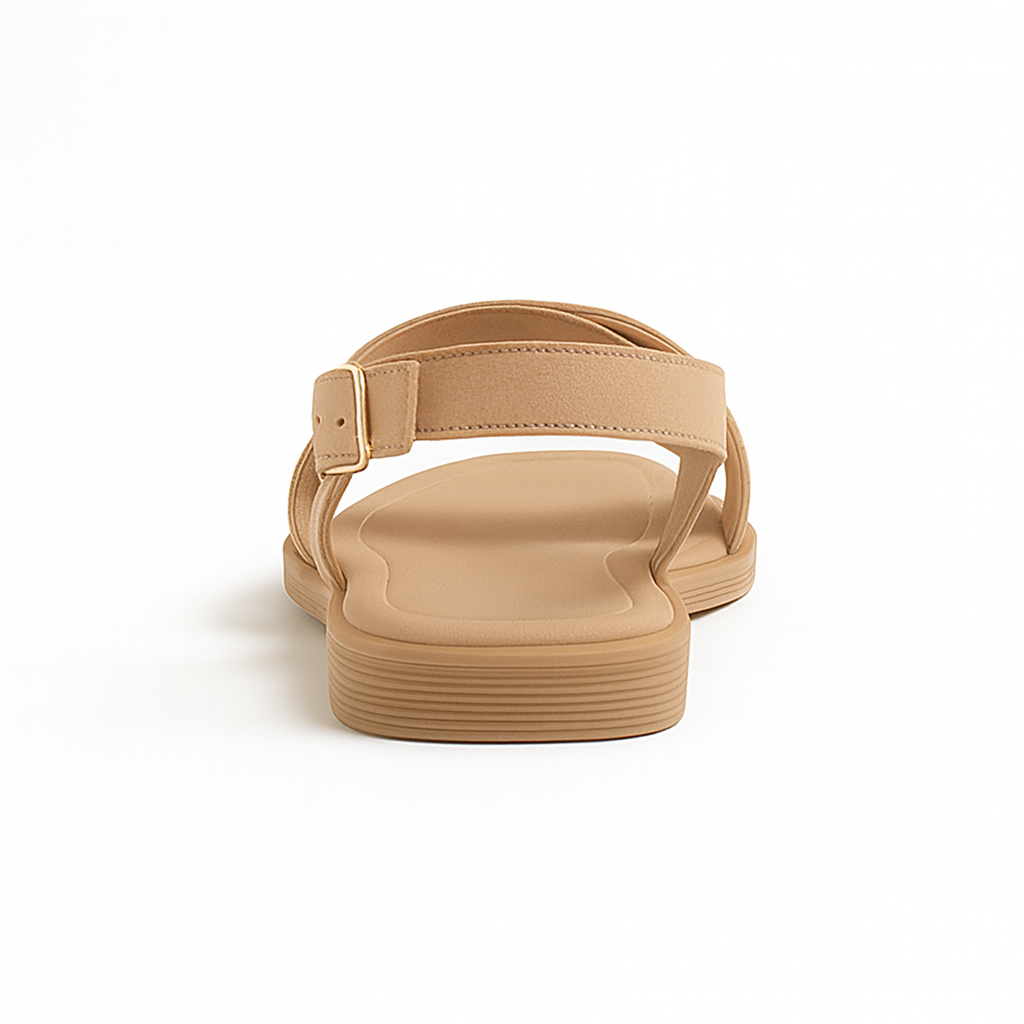 Sandalia beige con tiras cruzadas y suela cómoda.